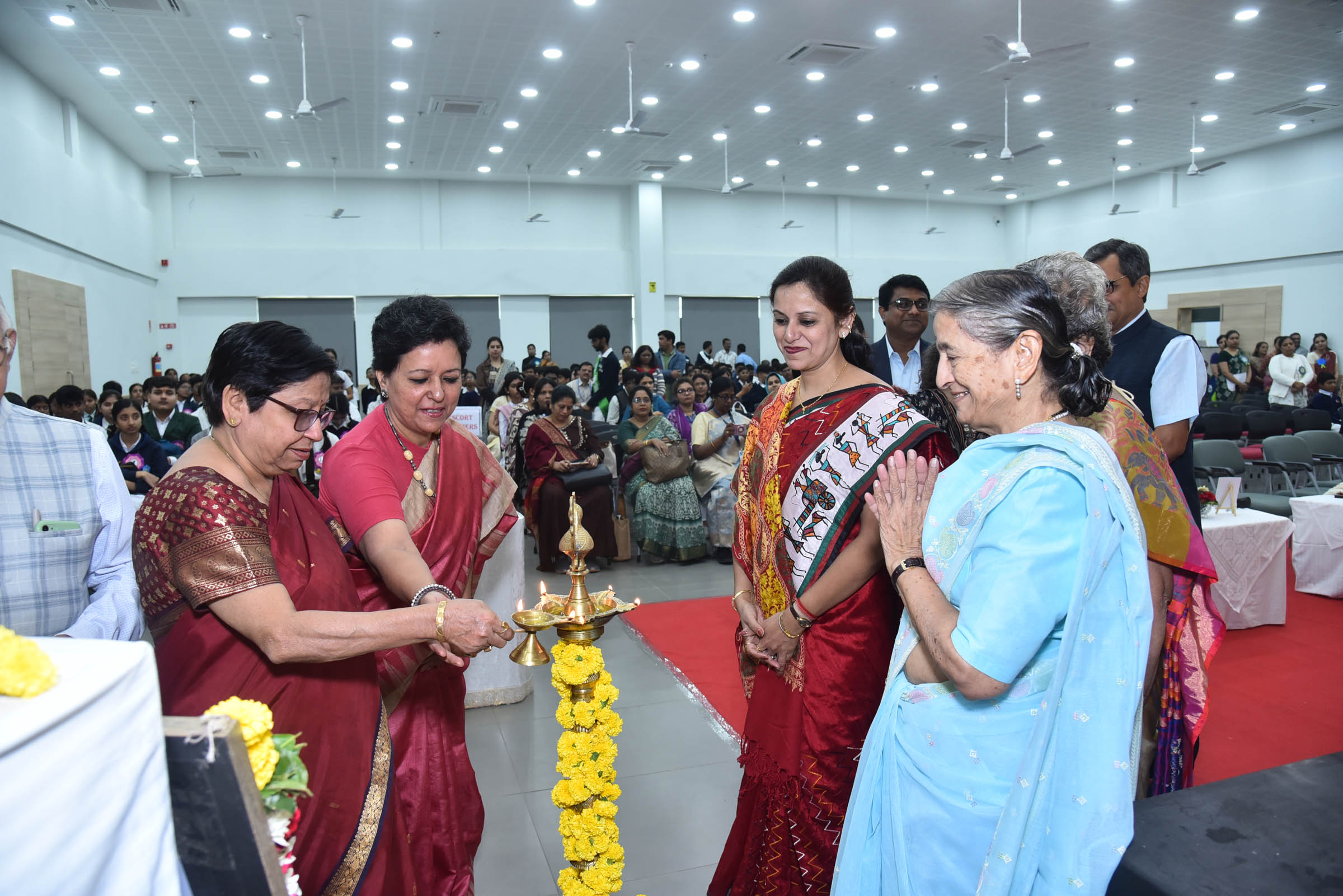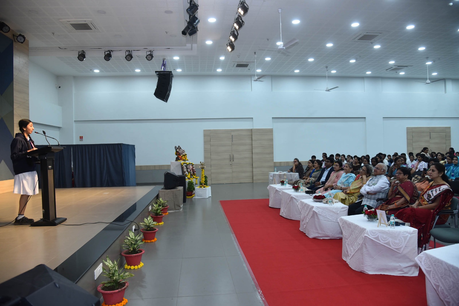 “Good, better, best. Never let it rest. 'Till your good is better and your better is best.” with these golden words Smt. Padmini Jog honourable chief guest elucidated various genre of efforts and struggles. The esteemed chief guest sang a beautiful aarti (devotional song) which expresses deep reverence and respect for Bharat Mata (Mother India). It is sung in praise of the beauty, greatness, and diversity of India.