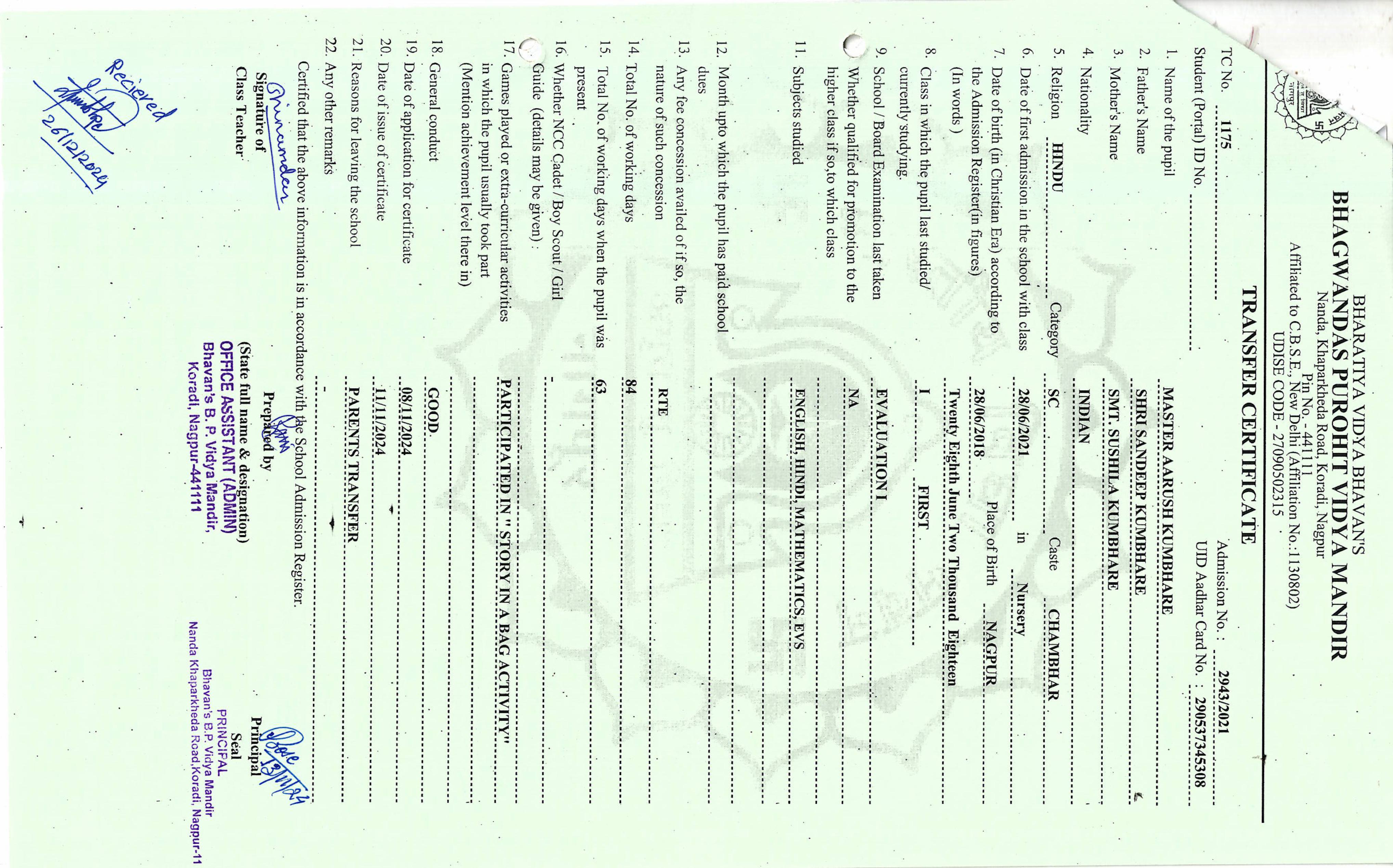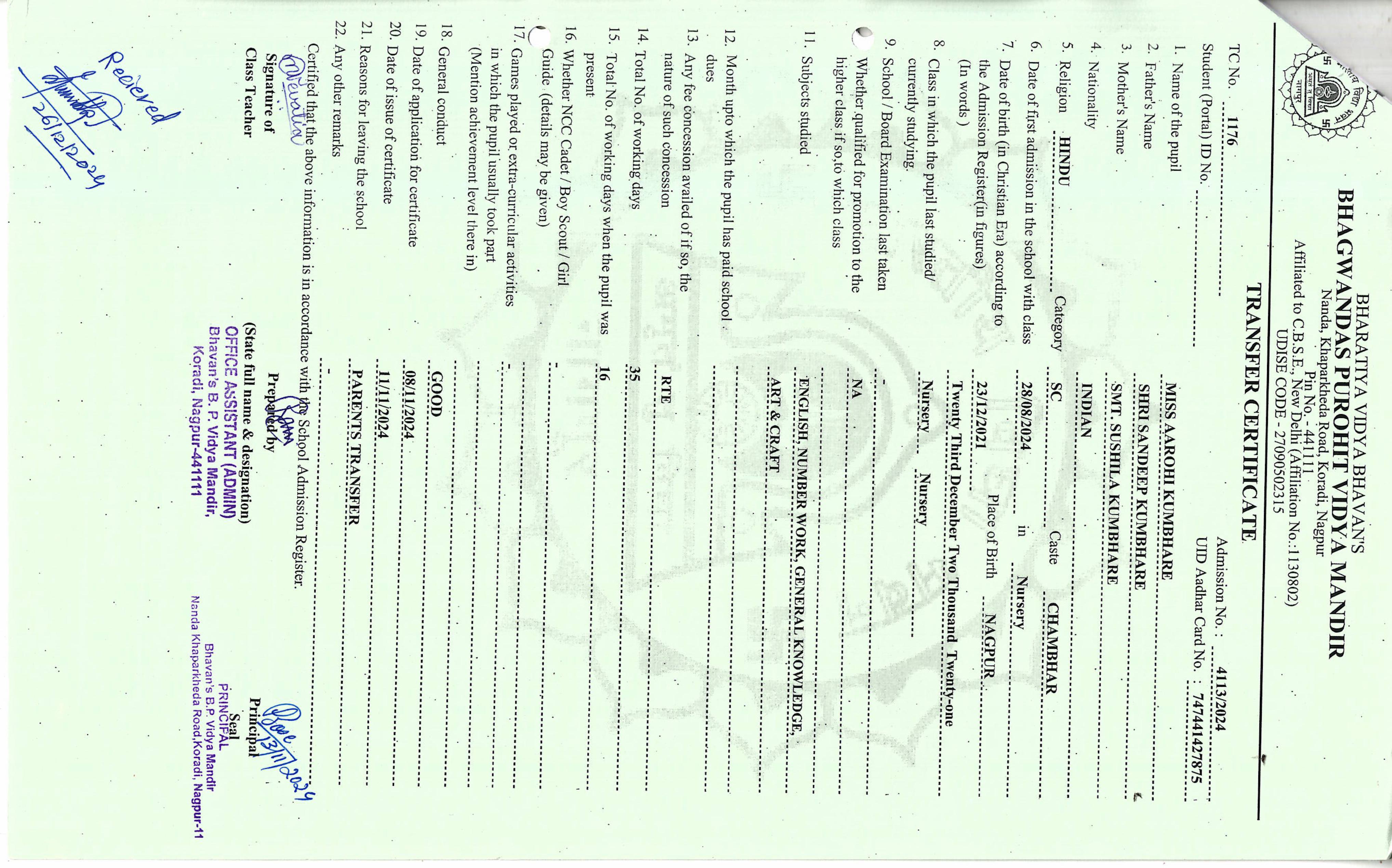 TC of students issued in the 2021